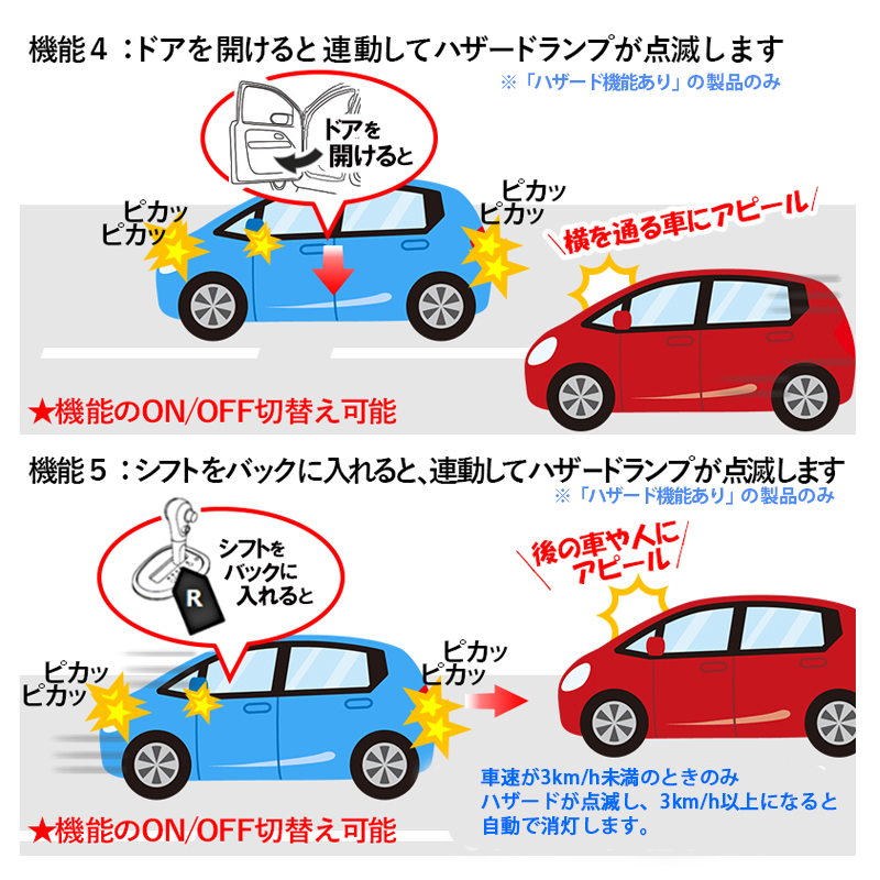 機能5:バック時は時速が3km/h以内の時に点滅します。時速が3km/hを超えるとハザードの点滅が止まります。