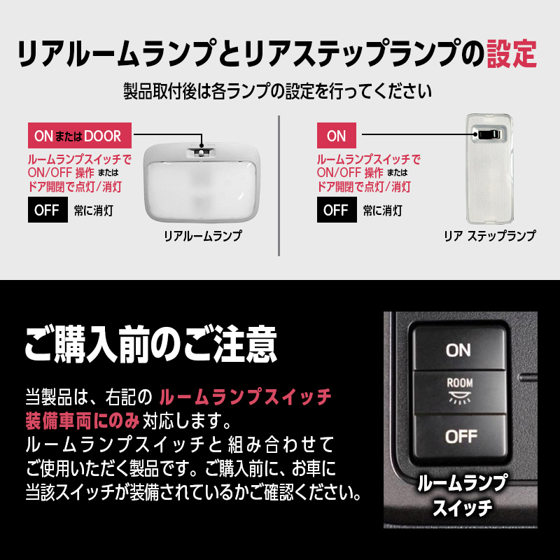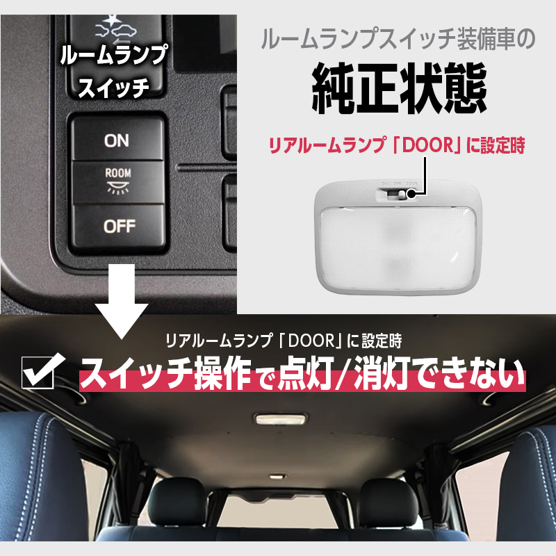 ※当製品は、ルームランプスイッチ装備車のみ対応しています。ルームランプスイッチと組み合わせてご使用いただく製品なります。