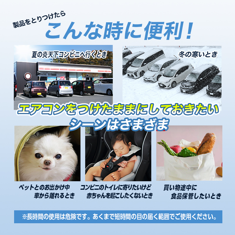 ちょっとしたコンビニでの買い物やペットを車に乗せたまま少し離れたい時・たくさん食材を積んだままの時などとても重宝すること間違いなし!車内をいつでも快適な温度に保てる優れものです!
