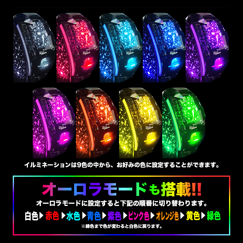・シフトノブは9色から選択可能で、握ると点滅するタッチ連動機能や、9色が順に変化するオーロラモードを搭載。