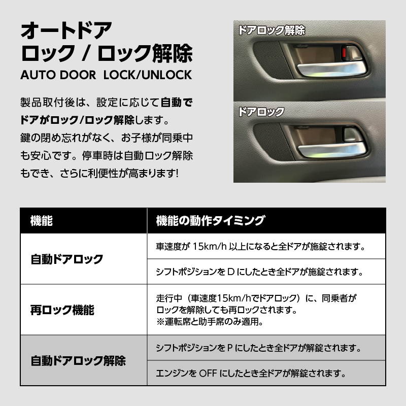 シフトを「D」に入れる、または時速約15km/hでドアを自動ロック。
