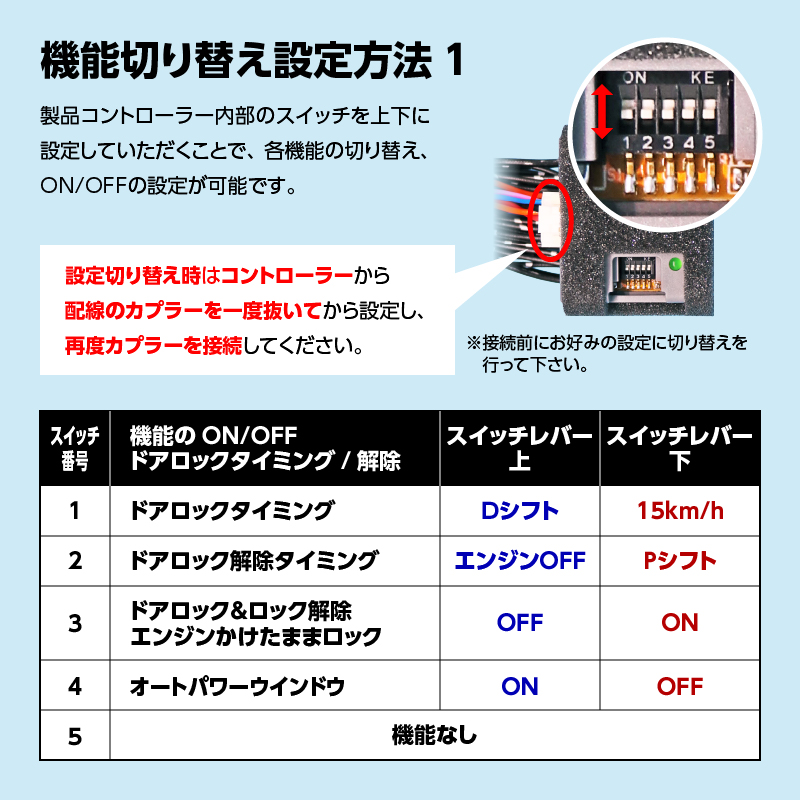 機能のON/OFFやロックタイミングはコントローラーBOXで切替可能です。