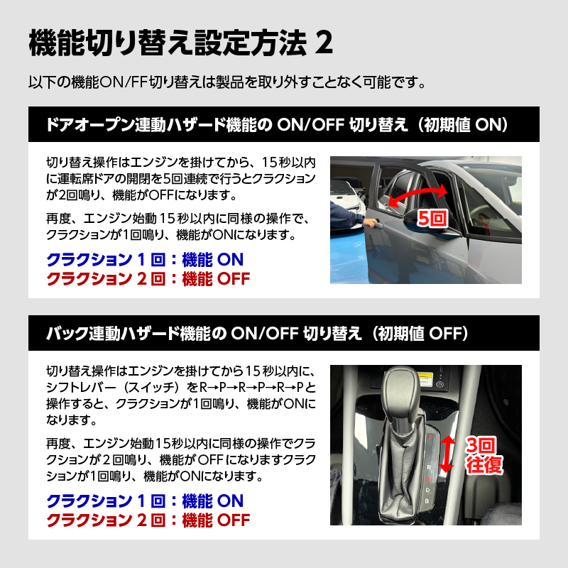 機能5:ドアオープン時ハザード機能【機能のON/OFF設定あり】