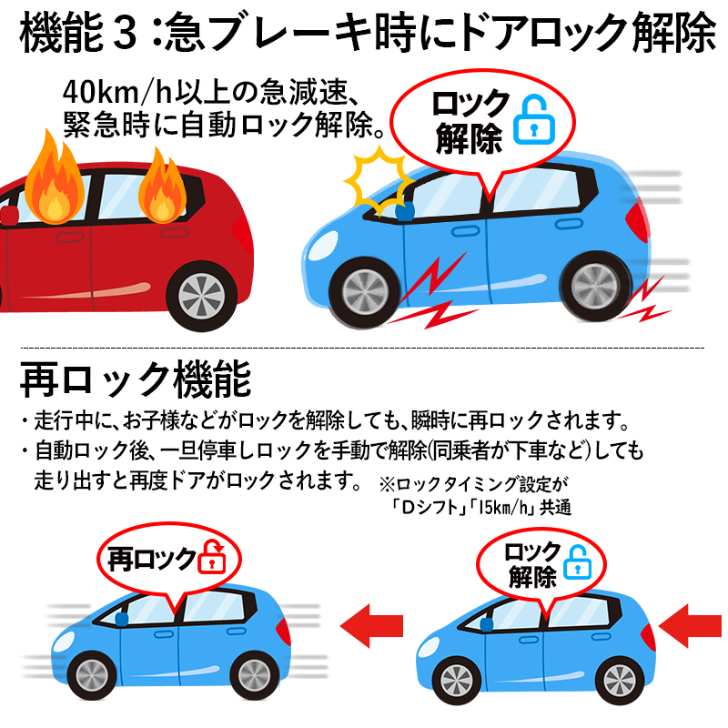 機能1:車速連動[Dシフト連動]オートドアロック【タイミング切替設定、機能のON/OFF設定あり】