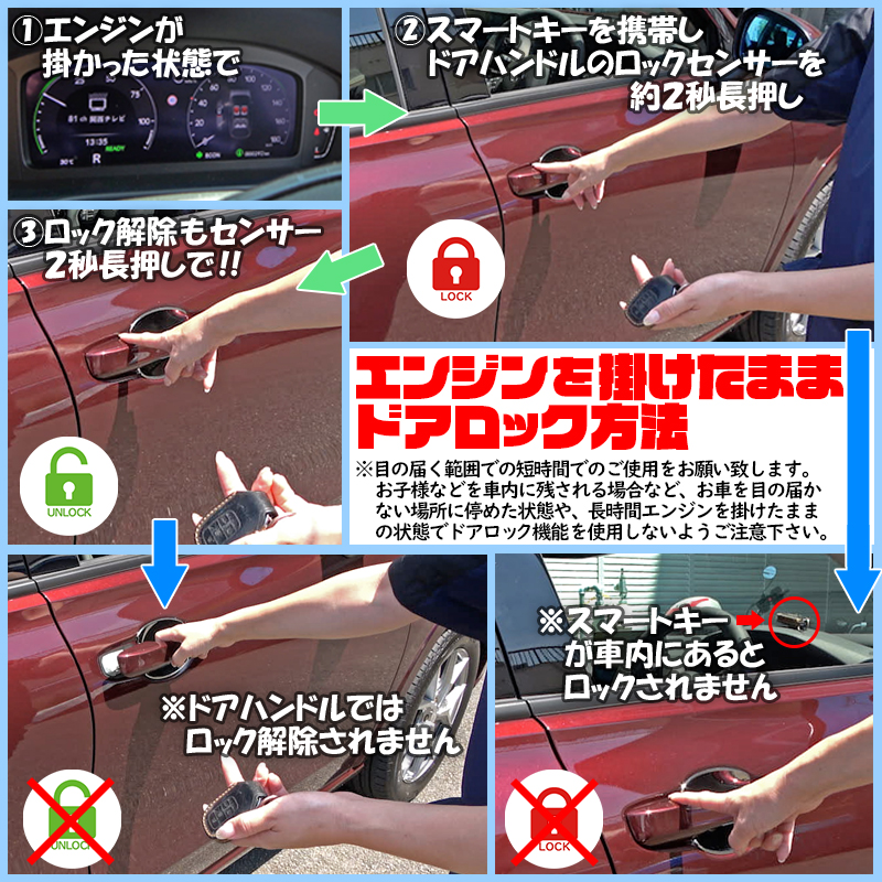 お子様などを車内に残される場合など、お車を目の届かない場所に停めた状態や、長時間エンジンを掛けたままの状態でドアロック機能を使用しないようご注意下さい。