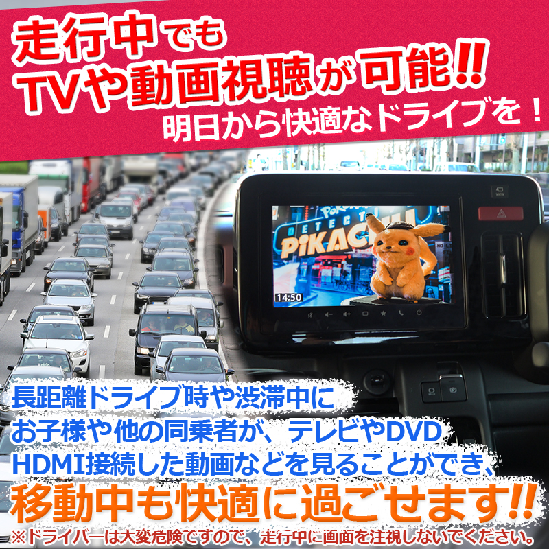 長距離ドライブ時や渋滞中にお子様や、他の同乗車がテレビやHDMI経由での動画を見ることができ、移動中も快適に過ごせます!!