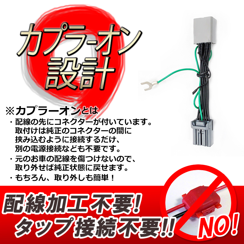 取付けはすべての配線先にコネクターが付いている完全カプラーオンなので、純正の配線を傷つけることなく、簡単にお取付が可能です。しかも純正状態に復帰も簡単!