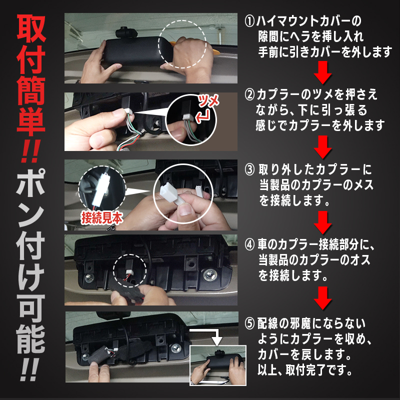 完全カプラーオンで取付簡単!ハイマウントストップランプの裏のコネクターに製品を挟み込むように接続するだけ!