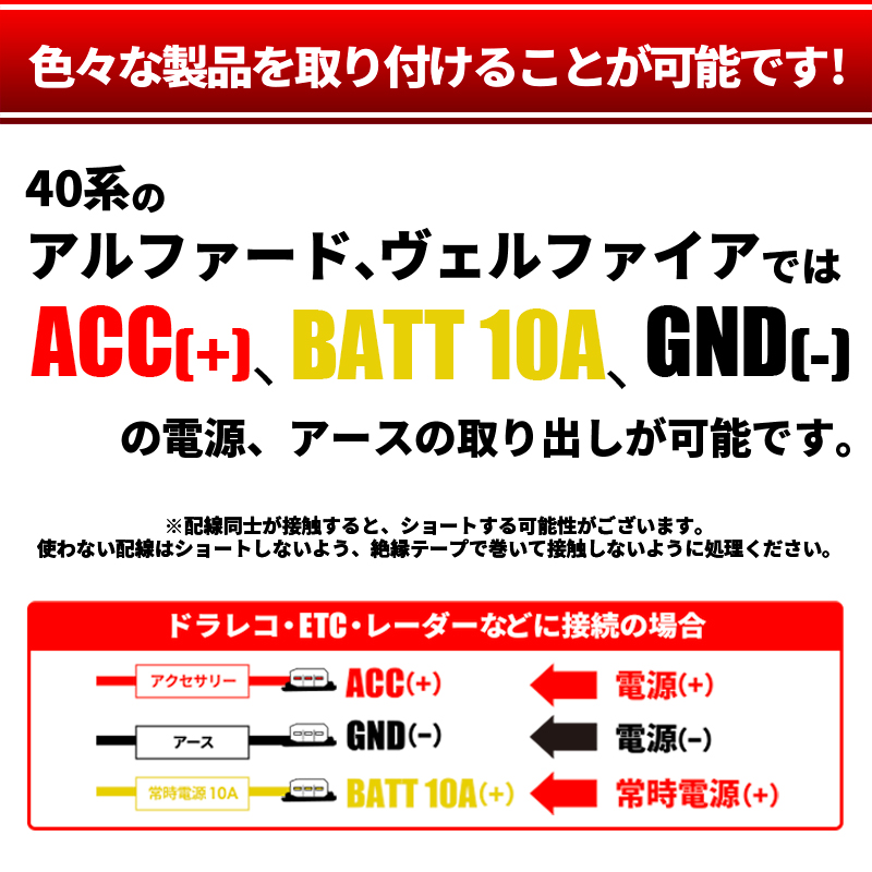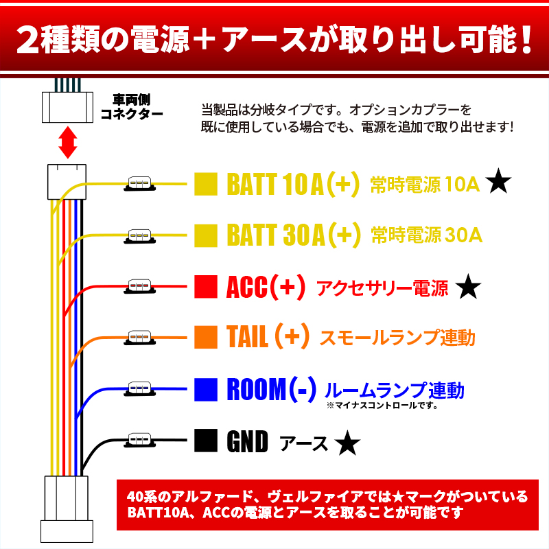 TOYOTA アルファード ヴェルファイア 40系対応 電源取り出しオプションカプラー I字タップ付属 常時電源 アクセサリー電源 アース