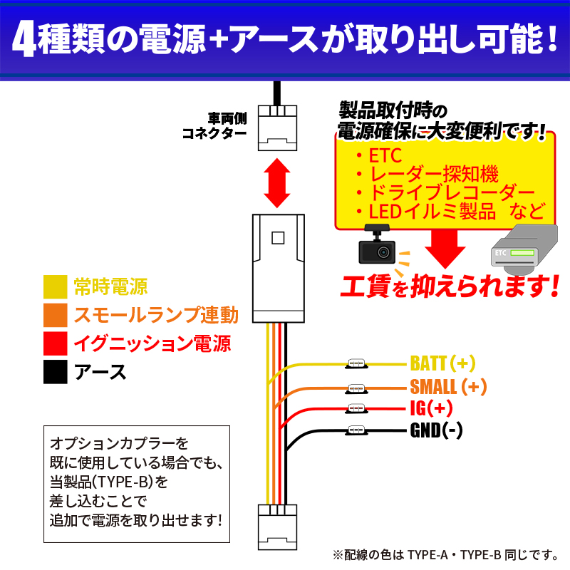 ポイント常時電源、IG、アース(マイナス)、SMALLの電源取りがこれひとつで取り出せます!
