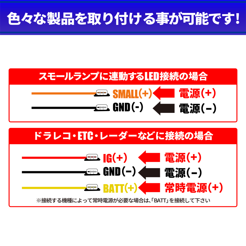 常時電源、IG、アース(マイナス)、スモールランプ連動の電源がこれひとつで取り出せます!