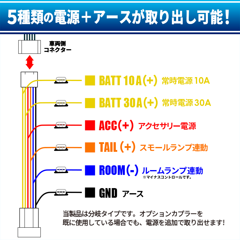 常時電源、ACC、アース(マイナス)、ルームランプ連動(マイナス)、スモールライト連動の5種類の電源取りがこれひとつで取り出せます!