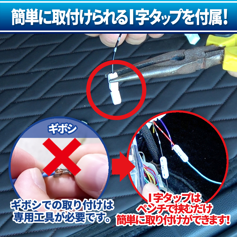 ◎ペンチでスグに分岐配線ができる、I字タップを採用!ペンチで挟むだけで簡単に電源を取り出せます!