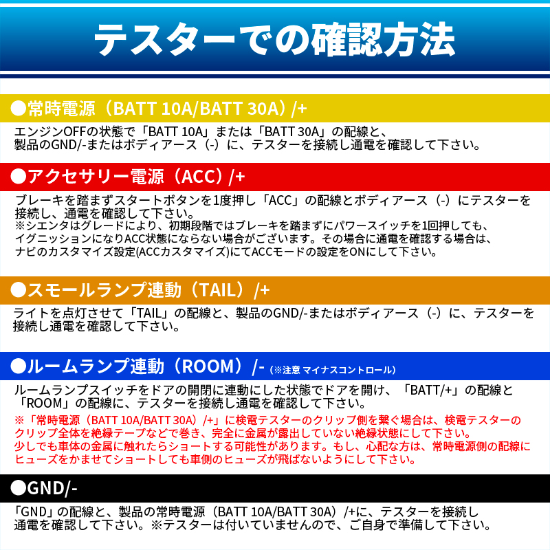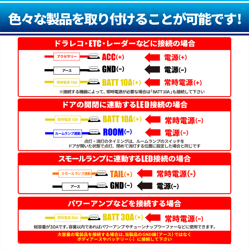 常時電源(10A)、常時電源(30A)、ACC、スモールランプ連動、ルームランプ連動電源+アースがこれひとつで取り出せます!