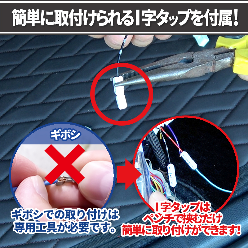 ペンチでスグに分岐配線ができる、I字タップを採用!ペンチで挟むだけで簡単に電源を取り出せます!