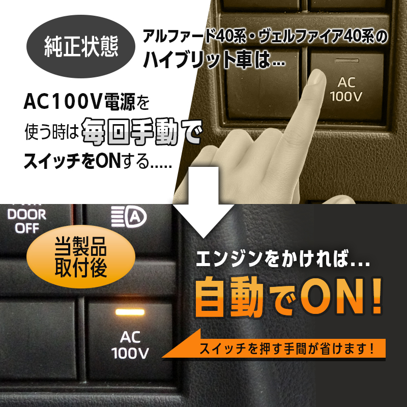 TOYOTA アルファード40系・ヴェルファイア40系 ハイブリッド車両 対応 オート AC100V スイッチ自動ONキット