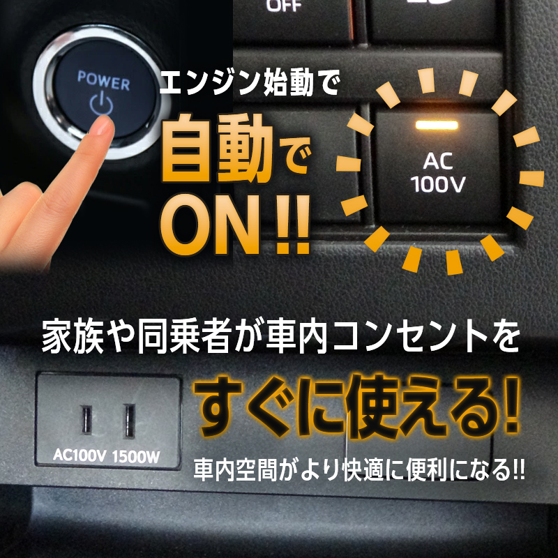ポイント ハイブリッド車についている純正のAC100Vスイッチですが、エンジン始動後、毎回手動でスイッチを押さなければならず少し手間がかかります。