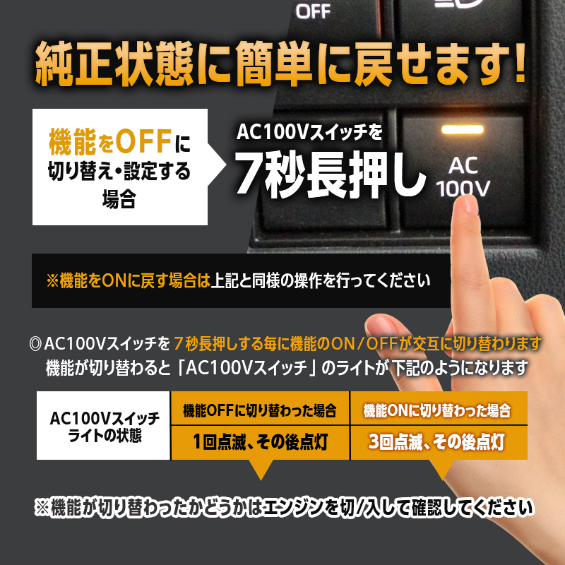 エンジンを始動すればAC100Vスイッチが自動でONに!! 機能のON/OFFの切り替え・設定も簡単で純正状態にもすぐに戻せます!!