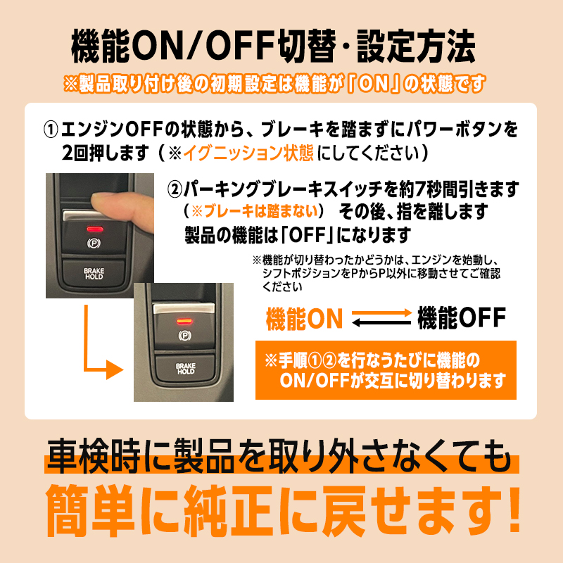 パーキングブレーキのONおよび解除がシフトに連動します!純正状態よりも操作数が軽減しシンプルで直感的に操作できます!