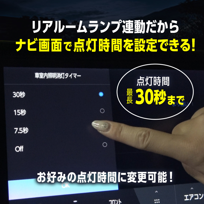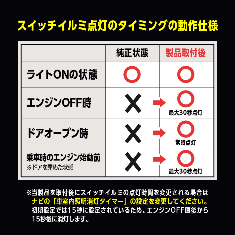 当製品は、ナビの「車室内照明消灯タイマー」の設定でスイッチイルミの点灯時間を7.5秒、15秒、30秒の中からお好きな時間に設定することができます。