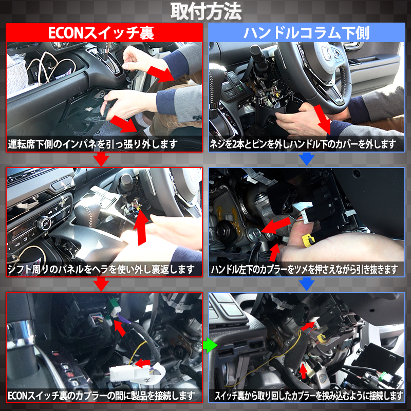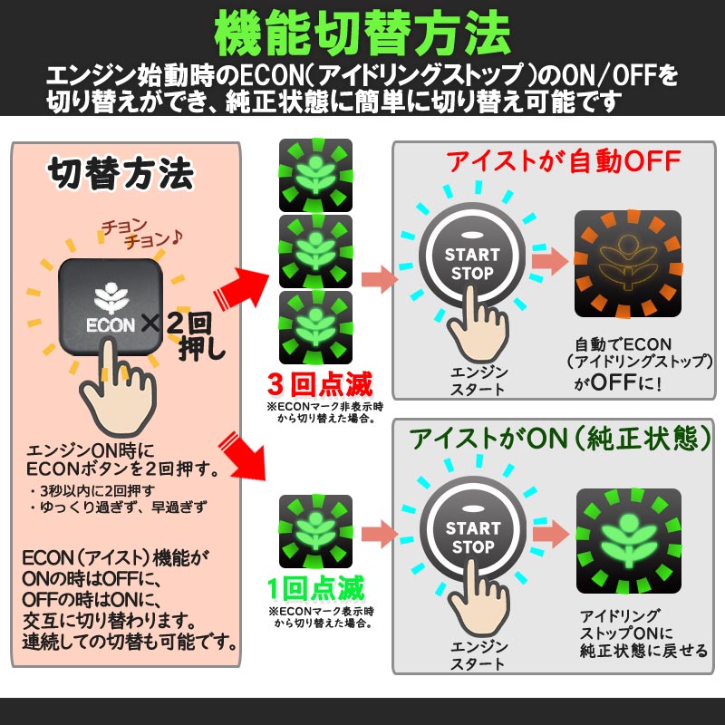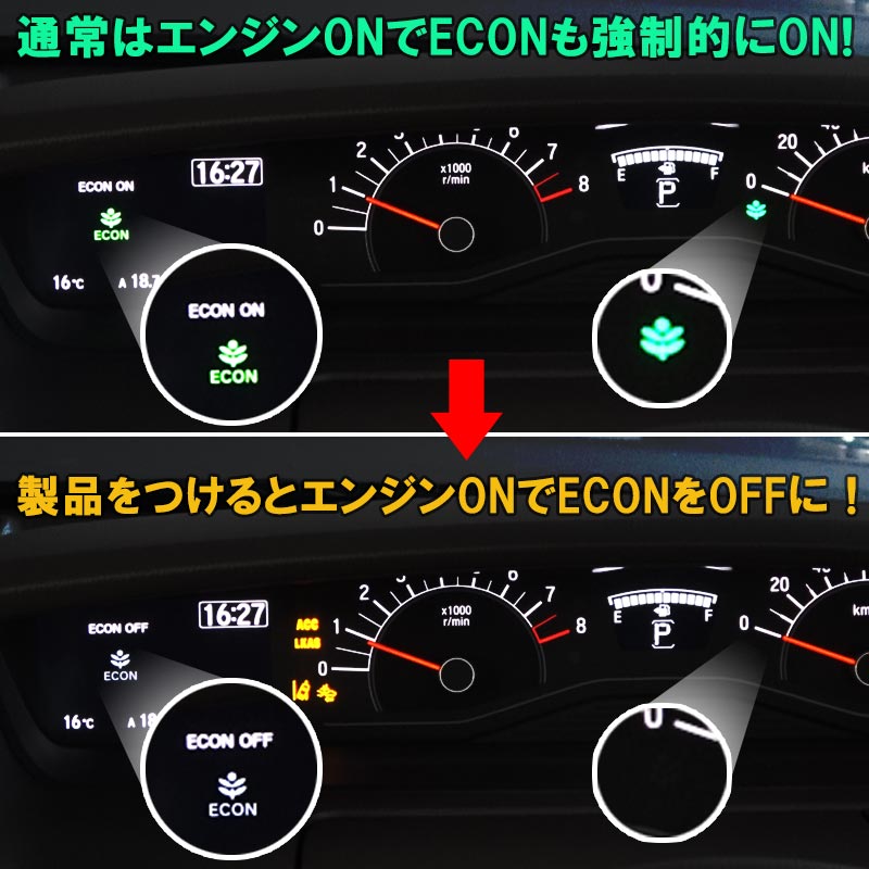 ※エンジンスターター搭載車で、エンジンスタータでのエンジン始動の場合、製品のECONキャンセラーの機能が働きません。 ご了承のうえご購入下さい。